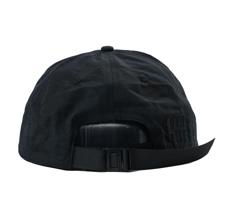 Nylon cap in Black with White embroidery. Subtle tonal back embroidery, with adjustable strap which tucks in