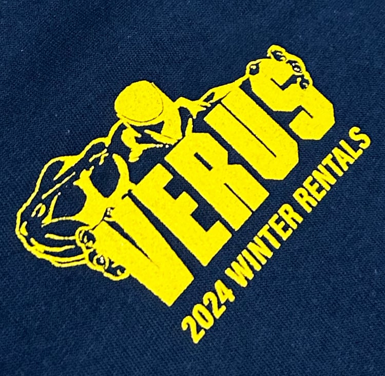 1-colour screen print on heavy weight 200gsm Navy tee. 100% combed cotton fabric and comfortable ribbed neck.