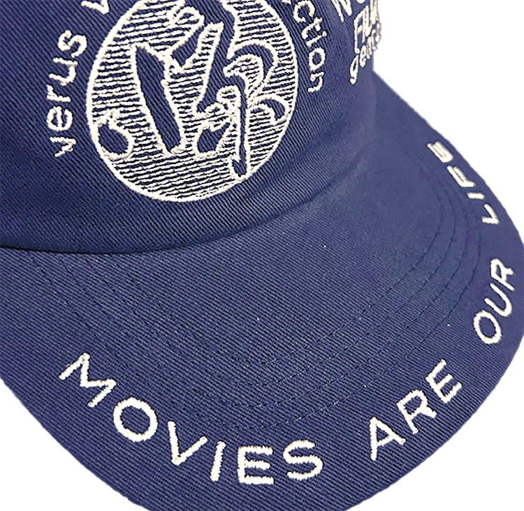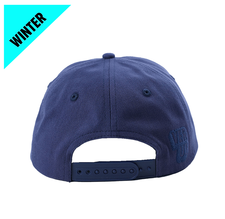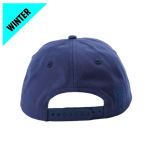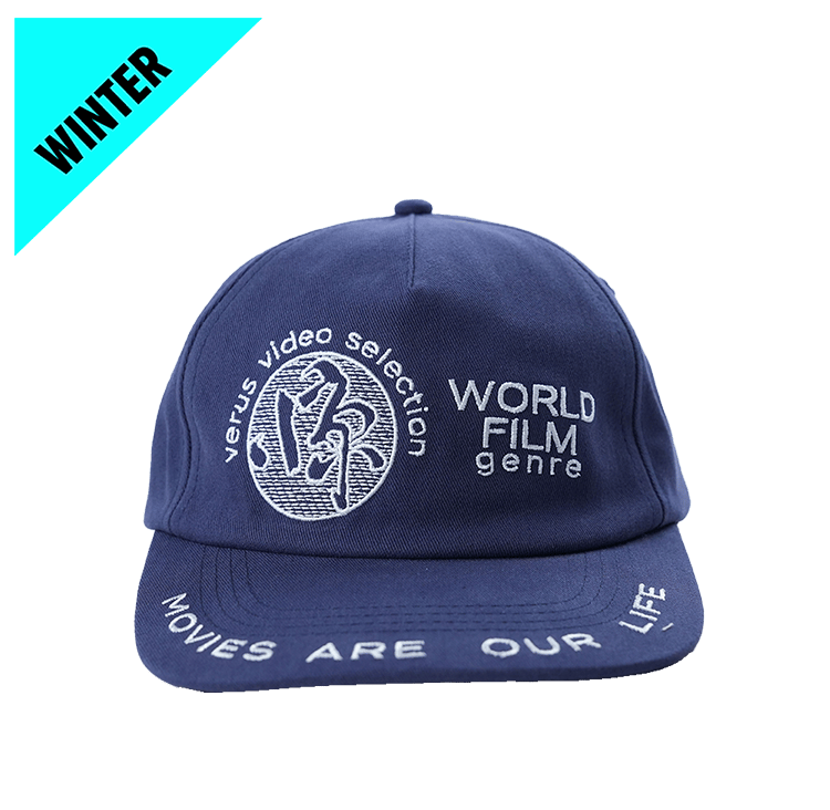 Navy cotton 5-panel unstructured cap with embroidery on the front, back and brim.